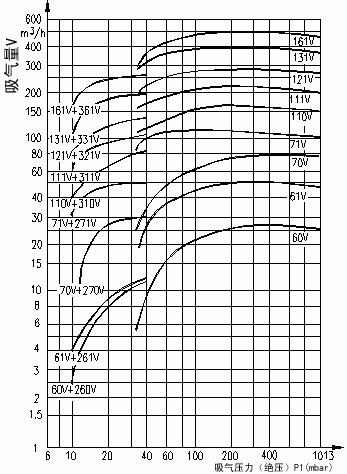 ③本例中為71V 注:該性能曲線是在吸入介質為20℃的飽和空氣,工作液溫度15℃,排氣壓力1013mba的狀態(tài)下得到的。性能允許差±10%,下圖為配用大氣噴射器的性能曲線。